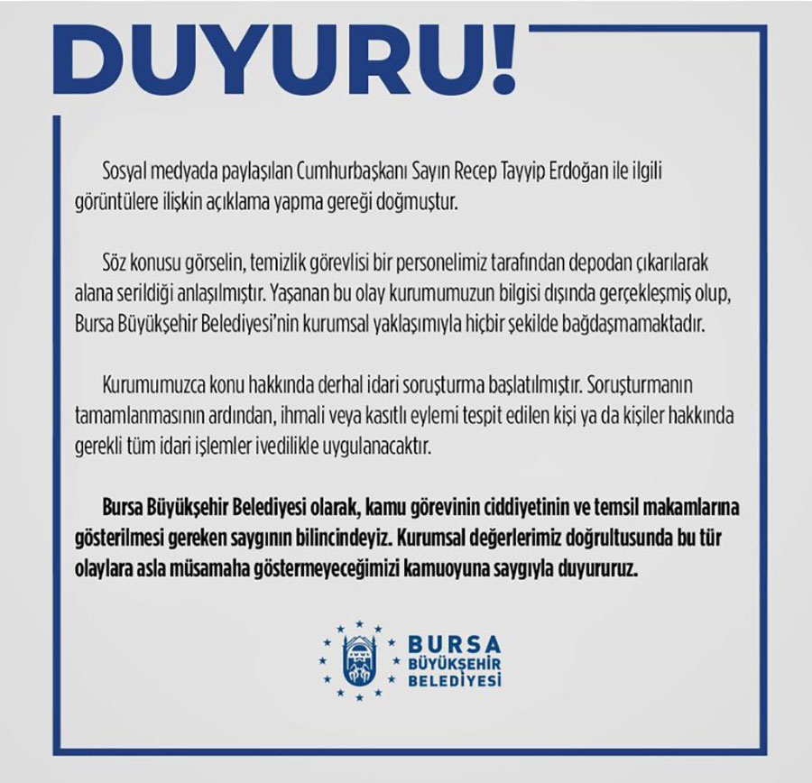 “Sosyal medyada paylaşılan Cumhurbaşkanı Sayın Recep Tayyip Erdoğan ile ilgili görüntülere ilişkin açıklama yapma gereği doğmuştur. Söz konusu görselin, temizlik görevlisi bir personelimiz tarafından depodan çıkarılarak alana serildiği anlaşılmıştır. Yaşanan bu olay kurumumuzun bilgisi dışında gerçekleşmiş olup, Bursa Büyükşehir Belediyesi’nin kurumsal yaklaşımıyla hiçbir şekilde bağdaşmamaktadır. Kurumumuzca konu hakkında derhal idari soruşturma başlatılmıştır. Soruşturmanın tamamlanmasının ardından, ihmali veya kasıtlı eylemi tespit edilen kişi ya da kişiler hakkında gerekli tüm idari işlemler ivedilikle uygulanacaktır. Bursa Büyükşehir Belediyesi olarak, kamu görevinin ciddiyetinin ve temsil makamlarına gösterilmesi gereken saygının bilincindeyiz. Kurumsal değerlerimiz doğrultusunda bu tür olaylara asla müsamaha göstermeyeceğimizi kamuoyuna saygıyla duyururuz.”